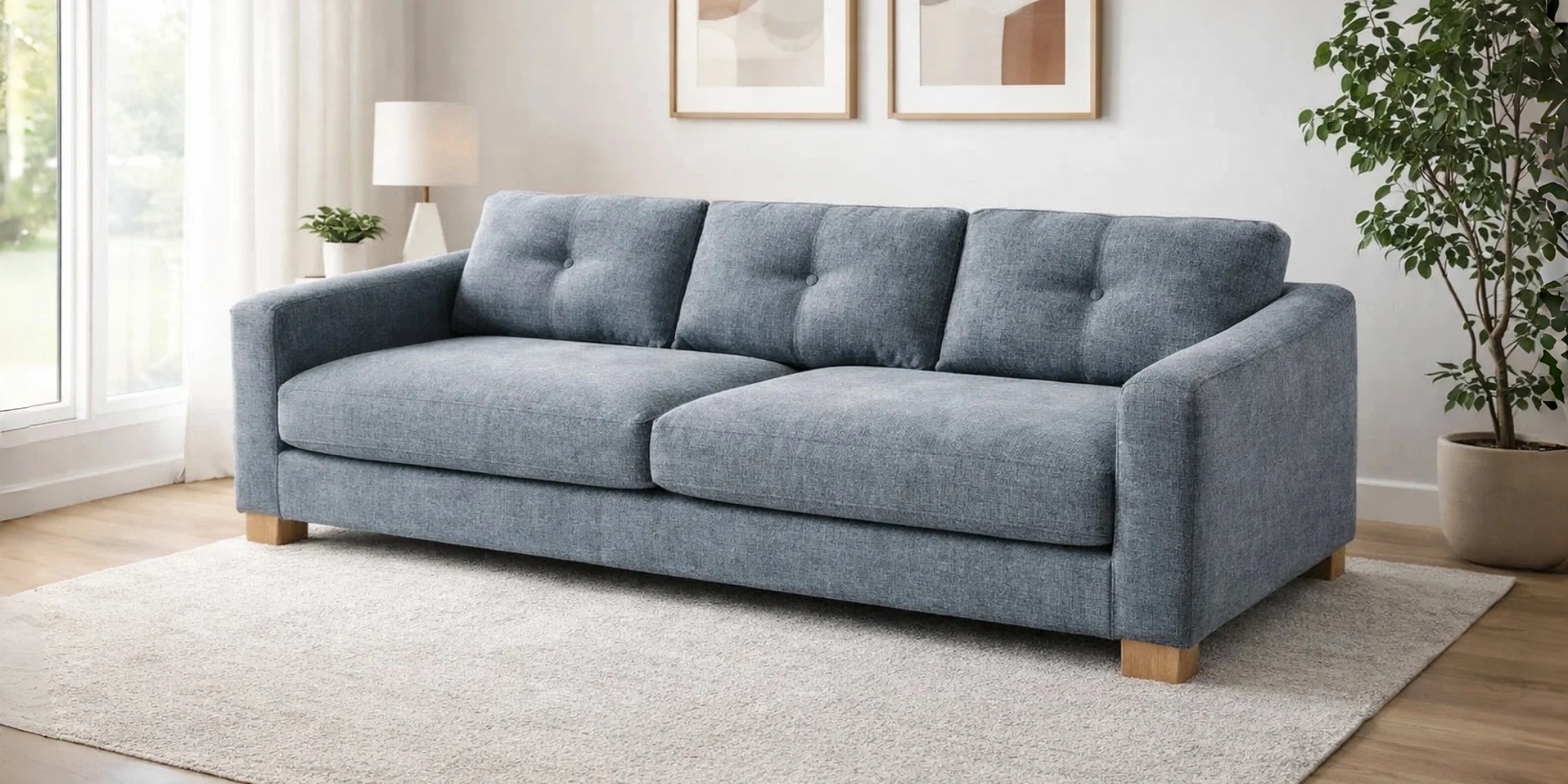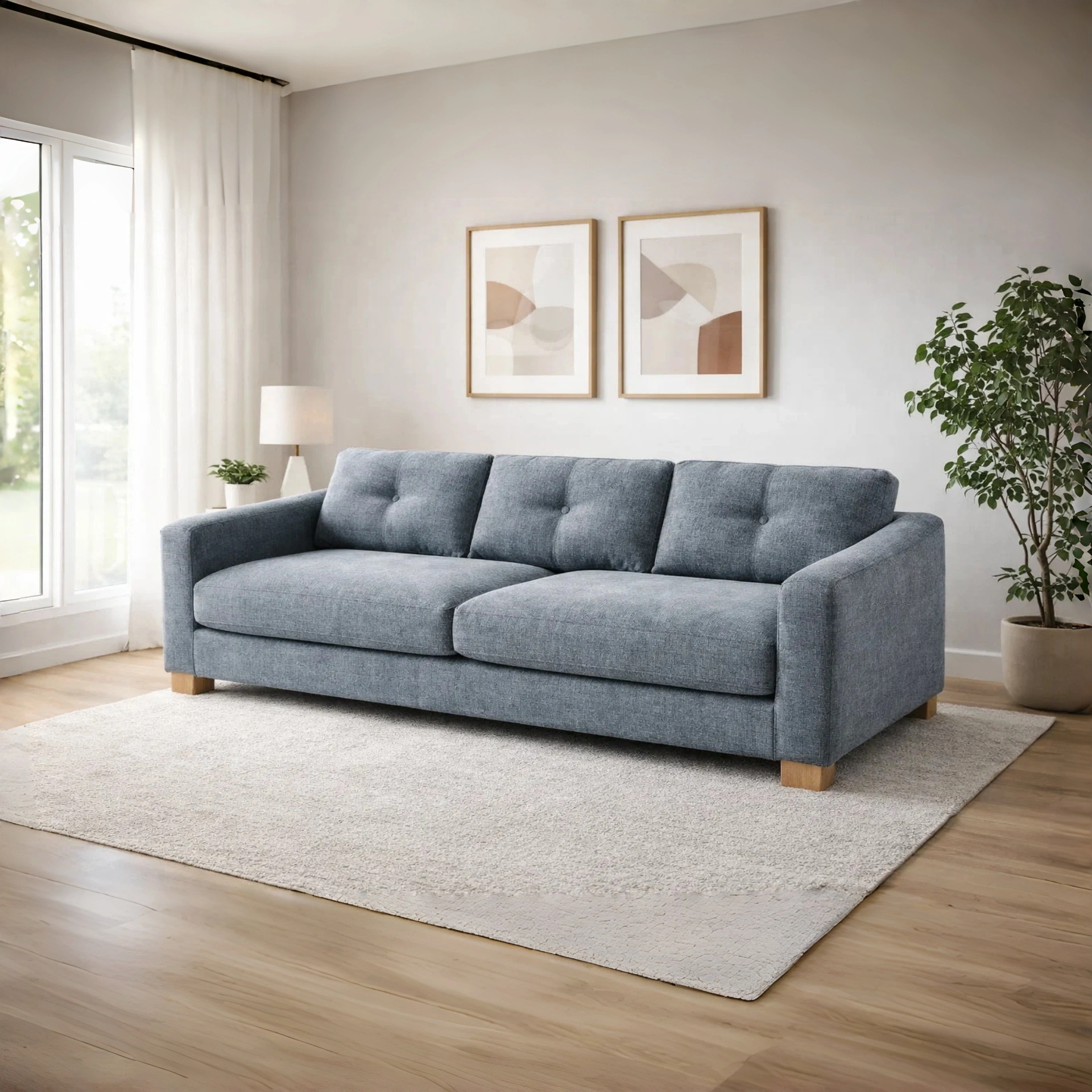 Sofá de 3 plazas en poliéster con patas de roble. Diseño funcional para distintos interiores.